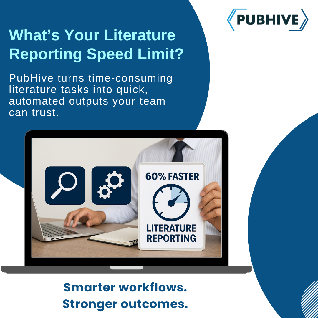 PubHive now delivers literature reporting up to 60% faster with AI automation, replacing manual steps with a unified, accurate, and compliant workflow.